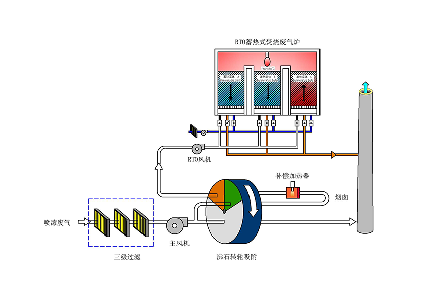 轉(zhuǎn)輪吸附凈化裝置--是采用固體吸附床對有機(jī)氣體進(jìn)行吸附濃縮,轉(zhuǎn)輪兩側(cè)由特制的密封裝置分成三個區(qū)域:吸附區(qū)、 脫附區(qū)及冷卻區(qū)域。經(jīng)預(yù)處理過濾去除漆霧、塵雜及水氣后的廢氣,通過緩慢旋轉(zhuǎn)的轉(zhuǎn)輪式沸石分子帰吸附床、廢氣均勻 地通過旋轉(zhuǎn)床斷面,由于沸石分子篩具有的吸附能力、有機(jī)廢氣分子通過沸石轉(zhuǎn)輪并經(jīng)一定的駐留時間,達(dá)到吸附清除有 機(jī)物的目的;在再生區(qū)域,轉(zhuǎn)輪進(jìn)入再生區(qū)吸附在轉(zhuǎn)輪上的有機(jī)物在熱空氣的作用下從沸石內(nèi)脫附出來,揮發(fā)物送至脫附 系統(tǒng)進(jìn)行處理實(shí)現(xiàn)再生,再生經(jīng)冷卻后可重新進(jìn)行吸附,隨著轉(zhuǎn)輪的不斷轉(zhuǎn)動,吸附、脫附、冷卻循環(huán)進(jìn)行,確保廢氣處 理持續(xù)穩(wěn)定的運(yùn)行。
